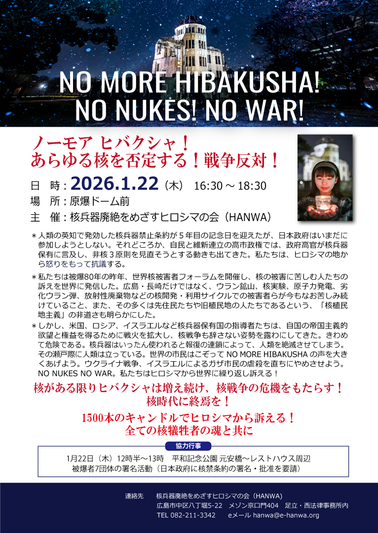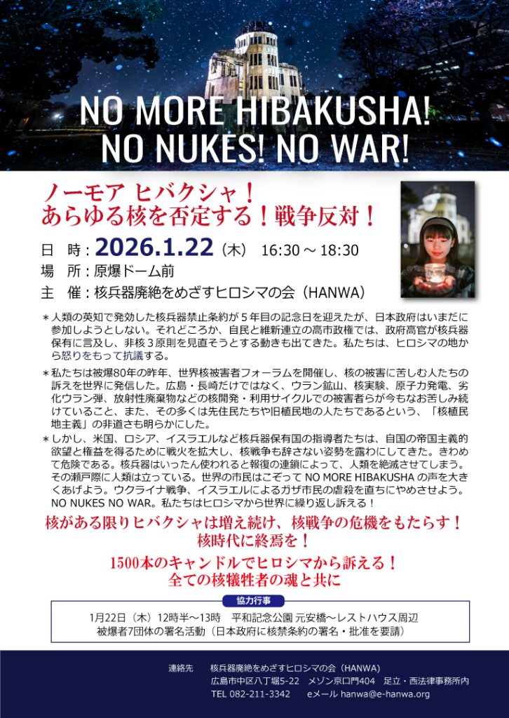 核兵器廃絶をめざすヒロシマの会(HANWA)は、1月22日(木)16時半から原爆ドーム前で、1500本のキャンドルを並べて核廃絶、戦争反対を世界に訴えるアピール行動をします。